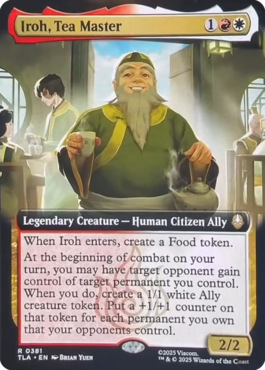 『アバター 伝説の少年アン』新カード情報:戦闘開始時にパーマネントを渡しトークンを生成する伝説の人間 投稿日: 2025年11月1日 投稿者:ゆうやん@管理人 カテゴリー:新カード情報 // 16 Comments 11月1日、11月22日発売の最新コラボセット『アバター 伝説の少年アン』に収録されるカードの情報が公開されました。 公開カード 《Iroh, Tea Mater》(1)(赤)(白) 伝説のクリーチャー – 人間・市民・同盟者 [R] このクリーチャーが戦場に出たとき、食物トークン1つを生成する。 あなたのターンの戦闘開始時に、あなたは「対戦相手1人を対象とし、あなたがコントロールしているパーマネント1つを対象とする。その前者はその後者のコントロールを得る。」を選んでもよい。そうしたとき、白の1/1の同盟者・クリーチャー・トークン1体を生成する。そのトークンの上に、あなたがオーナーでありあなたの対戦相手がコントロールしているパーマネント1つにつき、+1/+1カウンターを1個置く。 2/2 ソース dmottt スポンサーリンク 関連記事 『アバター 伝説の少年アン』新カード情報:トークン生成と全体強化の呪文や7枚ドロー、青のドロー祭殿など 11月1日、11月22日発売の最新コラボセット『アバター 伝説の少年アン』に収録されるカードの情報が公開されました。 公開カード ... 『アバター 伝説の少年アン』新カード情報:パーマネントを追放し、互いに3ドローし、アバターに変身する英雄譚など 11月1日、11月22日発売の最新コラボセット『アバター 伝説の少年アン』に収録されるカードの情報が公開されました。 公開カード ... 『アバター 伝説の少年アン』新カード情報:選んだクリーチャー以外すべてに気の技を行う4マナのソーサリーなど 11月1日、11月22日発売の最新コラボセット『アバター 伝説の少年アン』に収録されるカードの情報が公開されました。 公開カード ... 『アバター 伝説の少年アン』新カード情報:ソース・マテリアルバージョンの《無限の日時計》が公開 10月31日、11月22日発売の最新コラボセット『アバター 伝説の少年アン』に収録されるカードの情報が公開されました。 公開カード ... 『アバター 伝説の少年アン』新カード情報:相手が2枚目のカードを引くと2ドローできる護法・瞬速持ちのウナギ 10月31日、11月22日発売の最新コラボセット『アバター 伝説の少年アン』に収録されるカードの情報が公開されました。 公開カード ...