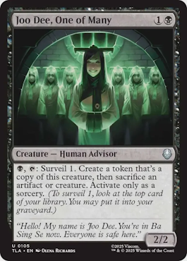 (黒), (T):諜報1を行う。このクリーチャーのコピーであるトークン1体を生成する。その後、アーティファクト1つかクリーチャー1体ヲ生け贄に捧げる。起動はソーサリーとしてのみ行う。