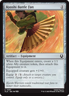 この装備品が戦場に出たとき、白の1/1の同盟者・クリーチャー・トークン1体を生成する。その後、この装備品をそれにつける。