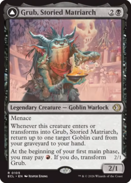 このクリーチャーが戦場に出るかGrub, Storied Matriarchに変身するたび、あなたの墓地にあるゴブリン・カード最大1枚を対象とし、それをあなたの手札に戻す。