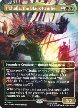 このクリーチャーが戦場に出るか攻撃するたび、ビブラニウム・トークンをタップ状態で生成する。(それは破壊不能と「(T):(◇)を加える。このマナはアーティファクトでない呪文を唱えるためには支払えない。を持つアーティファクトである)