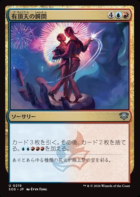 土地でないパーマネント1つとあなたのライブラリーの一番上にあるカードを追放する。それらのカードのオーナーは、それぞれ次の自分のターンの終了時まで、そのカードをプレイしてもよい。 |