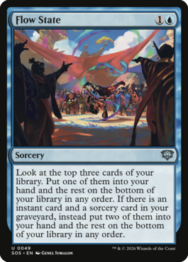 あなたのライブラリーの一番上から3枚のカードを見る。その中から1枚を選びあなたの手札に加え、残りを望む順番であなたのライブラリーの一番下に置く。あなたの墓地にインスタント・カードとソーサリー・カードがあるなら、代わりにそれらの中から2枚のカードをあなたの手札に加える。 |