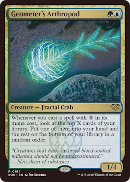 あなたがマナ・コストにXを含む呪文を唱えるたび、あなたのライブラリーの一番上からX枚のカードを見る。その中から1枚を選んであなたの手札に加え、残りをライブラリーの一番下に無作為の順番で置く。