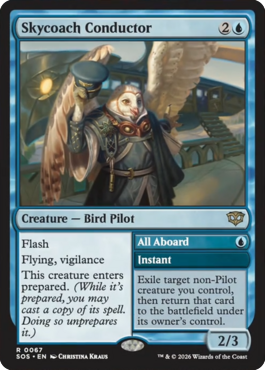 瞬速 2/3 《All Aboard》(青) あなたがコントロールしている操縦士でないクリーチャー1体を対象とし、それを追放する。その後、そのカードをオーナーのコントロール下で戦場に戻す。 |