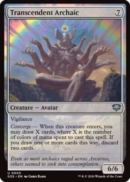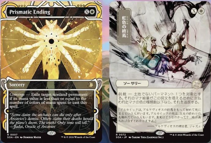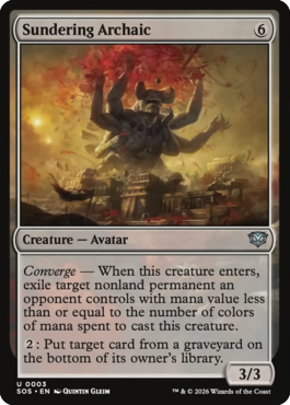 収斂 – このクリーチャーが戦場に出たとき、対戦相手がコントロールしていて、マナ総量がこれを唱えるために支払われたマナの色の種類以下である土地でないパーマネント1つを対象とし、それを追放する。 3/3 |