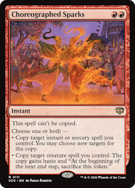 《振り付けされた火花/Choreographed Sparks》の2つ目のモードに記載されている「At the beginning of the next end step, sacrifice this token」からnextが削除されます。